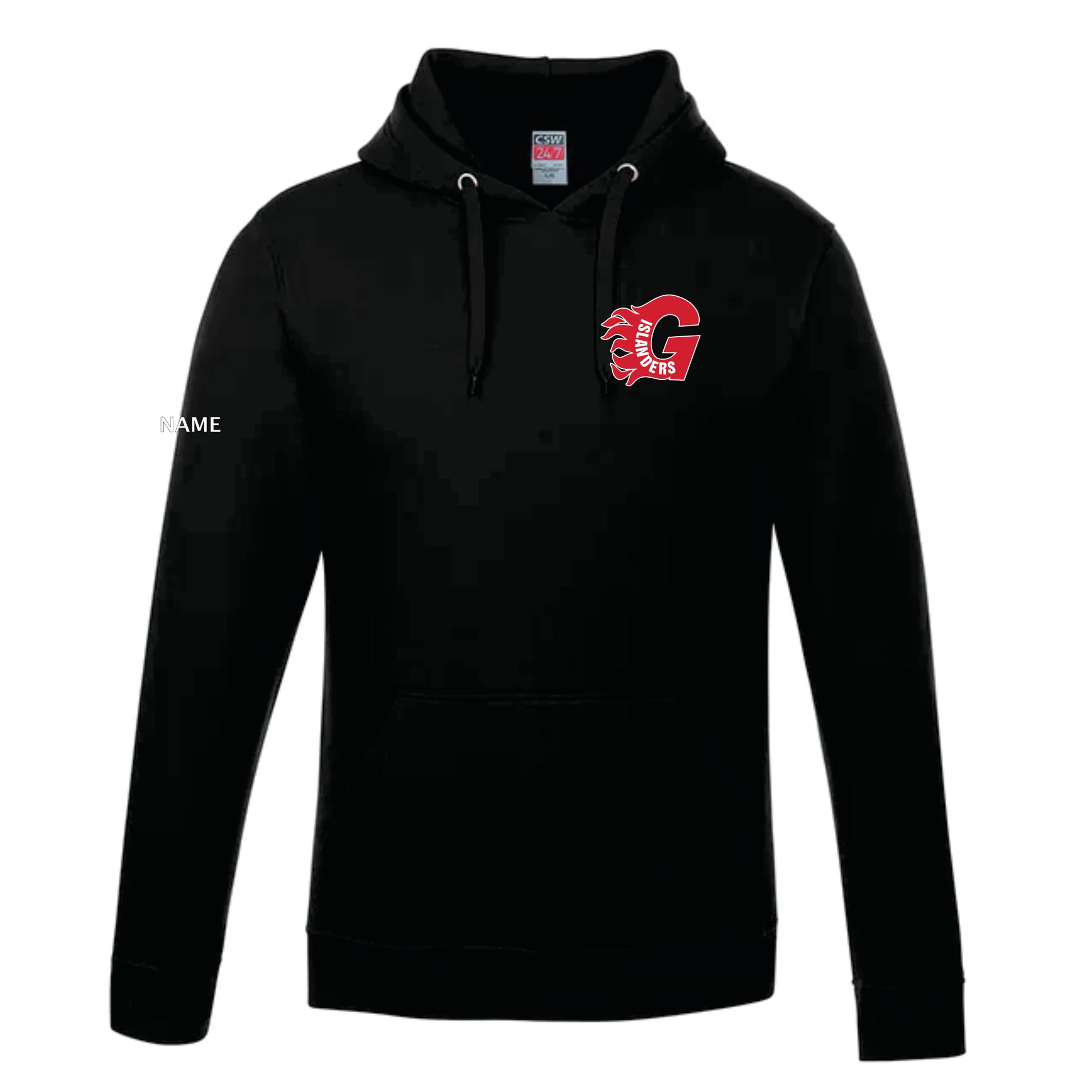 Full-zip hoodie in soft, ringspun poly-cotton, with a Gananoque Islanders crest embroidered on the left chest. Optional name on right sleeve (please specify above).